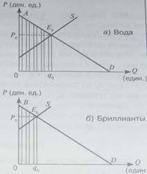 Рис. 5-2. > Парадокс воды и бриллиантов. Общая полезность потребляемого количества воды больше, чем общая полезность потребляемого количества бриллиантов. Но предельная полезность бриллиантов выше предельной полезности воды. Поэтому равновесная цена бриллиантов выше равновесной цены воды.