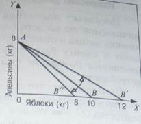 Снижение цены яблок с 24 до 20 р. денежном доходе Тани и прежней цене апельсинов приводит к повороту бюджетной линии против часовой стрелки вокруг точки пересечения бюджетной линии с вертикальной осью. Она из положения АВ переходит в положение АВ'. Увеличение цены яблок с 24 до 30 р. приводит к повороту бюджетной линии по часовой стрелке. Она займет положение АВ".