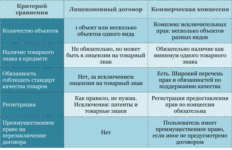 Договор коммерческой концессии – это соглашение правообладателя (франчайзера, franchiser) и пользователя (франчайзи, franchisee), по которому правообладатель обязуется предоставить пользователю за вознаграждение право использовать в предпринимательской деятельности комплекс принадлежащих правообладателю исключительных прав, деловой репутации и коммерческого опыта, включая право на товарный знак и другие предусмотренные договором объекты интеллектуальной собственности. Понятие договора франчайзинга закреплено в статье 1027 Гражданского кодекса. С юридической точки зрения, договор коммерческой концессии представляет разновидность лицензионного договора с множественностью объектов интеллектуальной собственности в предмете договора. Поэтому согласно п.4 ст.1027 ГК к договору франчайзинга применяются положения части IV Гражданского кодекса о лицензионном договоре. Отличить договор коммерческой концессии от лицензионного договора позволяют следующие признаки: § предоставление права использования нескольких связанных между собой объектов интеллектуальной собственности разного вида (например, товарный знак, произведения дизайна, ноу-хау, патенты, коммерческое обозначение). Как правило, лицензия предоставляется на один объект или на несколько объектов одного вида (например, несколько фонограмм, охраняемых смежными правами); § предоставление права на использование зарегистрированного товарного знака является обязательным признаком договора франчайзинга по российскому законодательству. Это объясняется тем, что договор коммерческой концессии в первую очередь предполагает использование имиджа и деловой репутации, созданных в результате активной рекламы и длительной работы на рынке. Трансферт технологий по коммерческой концессии вторичен по отношению к средствам индивидуализации; § широкий перечень прав и обязанностей сторон договора, связанных с поддержанием единых стандартов производства и продвижения товаров и обслуживания клиентов. Потребитель, приобретая товары или услуги, любого пользователя по договору франчайзинга, должен быть уверен в одинаковом качестве таких товаров и услуг. Потребителя интересует не конкретный производитель, а бренд. Условие об обеспечении единых стандартов качества товаров, кстати, устанавливаются в лицензионном договоре на товарный знак, но в нем кооперация между сторонами менее активная.