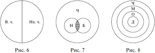 Понятия находятся в отношении противоречия, если одно из них представляет собой отрицание другого, причем в отличие от противоположных понятий между противоречащими понятиями не может быть третьего (среднего) варианта. Например, в отношении противоречия находятся понятия высокий человек (В. ч.) и невысокий человек (Нв. ч.). В том случае, когда одно понятие является отрицанием другого, третий вариант автоматически исключается: и низкий человек, и человек среднего роста – это невысокий человек. На схеме Эйлера отношение противоречия изображается одним кругом, поделенным на две части, которые обозначают противоречащие понятия (рис. 6). Отношениями соподчинения, противоположности и противоречия исчерпываются все случаи несовместимости между понятиями.