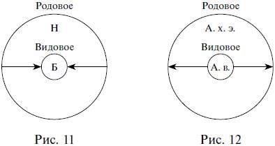 Обобщение понятия – это логическая операция перехода от видового понятия к родовому с помощью исключения из его содержания какого-либо признака (или нескольких признаков). Содержание понятия, лишенное каких-то признаков, уменьшается, но при этом автоматически увеличивается объем понятия, которое из видового становится родовым или обобщается. Например, если от содержания понятия биология (Б) отбросить признак изучать различные формы жизни, то оно превратится в понятие наука (Н), которое будет родовым по отношению к исходному видовому понятию биология (рис. 11). Если от содержания понятия атом водорода (А. в.) отбросить признак иметь один электрон, то оно превратится в понятие атом химического элемента (А. х. э.), которое будет родовым по отношению к исходному видовому понятию атом водорода (рис. 12).