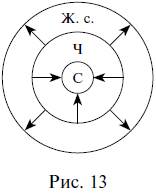 Ограничения и обобщения понятий складываются в логические цепочки, в которых каждое понятие (за исключением начального и конечного) является видовым по отношению к одному соседнему понятию и родовым по отношению к другому. Например, если последовательно обобщать понятие Солнце, то получится следующая цепочка: Солнце → звезда → небесное тело → физическое тело → форма материи. В этой цепочке понятие звезда является родовым по отношению к понятию Солнце, но видовым по отношению к понятию небесное тело; так же понятие небесное тело является родовым по отношению к понятию звезда, но видовым по отношению к понятию физическое тело, и т. д. Движение по нашей цепочке от понятия Солнце к понятию форма материи представляет собой серию последовательных обобщений, а движение в обратном направлении – серию ограничений. Если изобразить отношения между понятиями из указанной цепочки на схеме Эйлера, то получатся круги, последовательно располагающиеся один в другом: самый маленький будет соответствовать понятию Солнце, а самый большой – понятию форма материи. Пределом цепочки ограничения любого понятия всегда будет какое-либо единичное понятие, а пределом цепочки обобщения, как правило, будет какое-либо широкое, философское понятие, например: объект мироздания, форма материи или форма бытия. Наиболее частые ошибки, которые допускают при ограничении и обобщении понятий, заключаются в том, что вместо вида для какого-то рода называют часть из некоего целого, и вместо рода для какого-то вида называют целое по отношению к какой-либо части. Например, в качестве ограничения понятия цветок предлагают понятие стебель. Действительно, стебель – это часть цветка, но ограничить понятие – значит подобрать не часть для целого, а вид для рода. Следовательно, правильным ограничением понятия цветок будет понятие ромашка, или тюльпан, или хризантема и т. п. В качестве обобщения понятия дерево нередко предлагают понятие лес. Конечно же, лес является неким целым по отношению к деревьям, из которых он состоит, но обобщить понятие – значит подобрать не целое для части, а род для вида. Следовательно, правильным обобщением понятия дерево будет понятие растение, или объект флоры, или живой организм и т. п. Итак, почти любое понятие (за исключением единичных и широких, философских) можно как ограничить, так и обобщить. Другими словами, подобрать для него как видовое понятие, так и родовое. Например, ограничением понятия человек (Ч) будет понятие спортсмен (С) или писатель, или мужчина, или молодой человек и т. п., а его обобщением будет понятие живое существо (Ж. с.) (рис. 13).