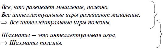 Все, что развивает мышление, полезно. Все интеллектуальные игры развивают мышление. Шахматы – это интеллектуальная игра. => Шахматы полезны.