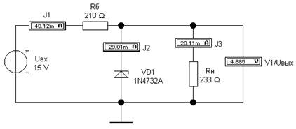Рис. 2. Параметрический стабилизатор напряжения В этой схеме стабильность выходного напряжения определяется в основном параметрами стабилитрона VD1. Входное напряжение U вх должно быть больше напряжения пробоя стабилитрона U ст. Для ограничения тока через стабилитрон устанавливается балластный резистор R б, на котором падает разность напряжений U вх – U ст. Часть входного напряжения теряется на этом резисторе, а оставшаяся часть приложена к нагрузке. Функцию нагрузки в схеме выполняет сопротивление R н, величину которого можно задавать при проведении исследования. Колебания входного напряжения U вх или тока нагрузки I н приводят к изменению тока через стабилитрон I ст. Наибольший ток через стабилитрон протекает при максимальном входном напряжении и минимальном токе нагрузки: