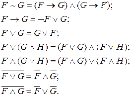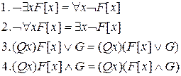 Кроме них, существуют другие пары эквивалентных формул, содержащих кванторы. Чтобы подчеркнуть, что свободная переменная х входит в формулу F, формулу F представим в виде F [ x ], ниже формула G, не содержит переменной х. Выполняются следующие пары эквивалентных формул.