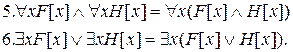 Законы 3 и 4 истины, т.к. G не содержит х и может быть внесена в область действия квантора Q. Законы 1,2 нетрудно доказать, рассматривая произвольные интерпретации I с областью D и различные варианты истинности для соответствующих формул. Пусть F [ x ], H [ x ] - две формулы, содержащие х тогда: