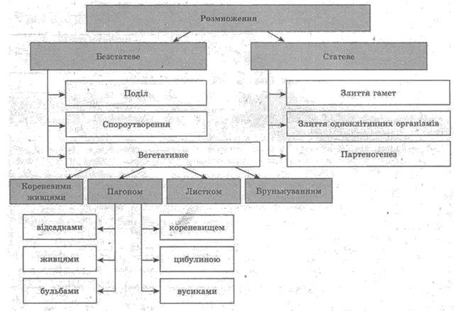 Статеве розмноження властиве представникам усіх типів тварин і рослинам. Характерною формою статевого розмноження в одноклітинних є постійне (копуляція) або тимчасове (кон’югація) злиття двох клітин. При кон’югації відбувається обмін ядерною речовиною і цитоплазмою. В усіх випадках статевого розмноження при злитті гамет утворюється одноклітинний зародок — зигота, із якої в процесі розвитку формується зрілий організм. Особливою формою статевого розмноження є партеногенез (від грец. раrthеnоs — незаймана та genesis — походження), при якому нова особина розвивається з незаплідненої яйцеклітини або, рідше, сперматозоїдів (попелиці, дафнії). Гаметогенез — це процес утворення статевих клітин. Тварини мають диплоїдний набір хромосом. У процесі гаметогенезу, в основі якого лежить мейоз, утворюються гамети, що мають гаплоїдний набір хромосом. Гамети утворюються у статевих залозах або спеціалізованих клітинах. У тварин це сім’яники та яєчники. Гаметогенез відбувається послідовно у трьох стадіях і закінчується дозріванням гамет. Стадія розмноження. Первинні статеві клітини з диплоїдним набором хромосом 2n діляться шляхом мітозу, внаслідок чого їх кількість зростає. Стадіяросту. Поділ клітин не відбувається. Вони збільшуються в об’ємі, нагромаджують поживні речовини. Ця стадія нагадує інтерфазу. Стадія дозрівання. Відбувається мейоз, остаточно формуються і дозрівають гамети. Сперматогенез — процес утворення чоловічих статевих клітин — сперматозоїдів. На стадії розмноження у сперматогенній тканині в результаті мітозу утворюються численні клітини — сперматогонії (від грец. spermatos — насіння та gone — породження), що мають диплоїдний набір хромосом (2n). На стадії росту сперматогонії трохи збільшуються, і з кожної клітини розвивається сперматоцит (від грец. kytos — клітина) І порядку, здатний до редукційного поділу. На стадії дозрівання у процесі 1-го поділу мейозу утворюються два сперматоцити II порядку, а в процесі 2-го поділу чотири гамети — сперматиди, що мають гаплоїдний набір хромосом (n). Усі чотири клітини, однакові за розміром, дозрівають і утворюють чотири однакових за розміром сперматозоїди. Сперматозоїди — невеликі рухливі клітини, що складаються з головки, шийки та хвостика. Головка містить ядро та незначну кількість цитоплазми. В передній частині головки розташована акросома (від грец. akron — верхівка та soma — тіло), яка утворюється в процесі сперматогенезу з елементів комплексу Гольджі. Акросома містить ферменти, які розчиняють оболонку яйцеклітини. В шийці містяться центріолі та численні мітохондрії, які забезпечують сперматозоїд енергією під час його руху. Хвостик слугує для руху сперматозоїда і за будовою схожий із джгутиком в одноклітинних. Оогенез — процес утворення жіночих статевих клітин — яйцеклітин. На стадії розмноження в оогенній тканині формується велика кількість клітин — оогоній (2n). Вони розмножуються шляхом мітозу. Кожна оогонія на стадії росту починає інтенсивно збільшуватися в розмірах, накопичує поживні речовини у вигляді зерен жовтка. Вона перетворюється в ооцит І порядку. Процес росту ооцита значно триваліший, ніж сперматоцита. Під час мейозу ооцит І порядку ділиться асиметрично. Після 1-го поділу утворюється одна велика клітина — ооцит II порядку, в яку переходять усі поживні речовини, і одна д