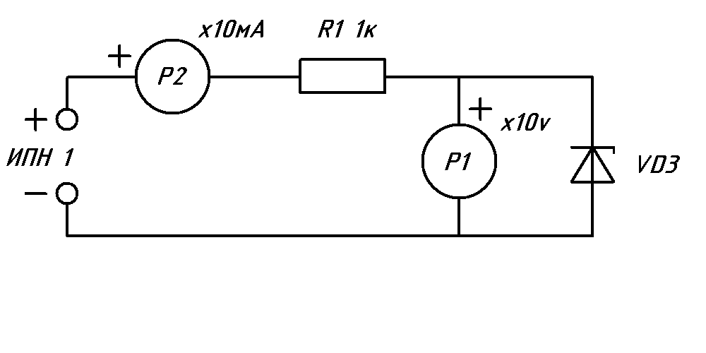 2.3.3 Установить приборы в следующие режимы: P1(mA; x10); P2(V; x1). 2.3.4 Определить цену деления каждого прибора и записать в отчет на схеме. 2.3.5 Снять зависимость Iпр. = f (Uпр.), изменяя Iпр. от 0 до 10 мА с интервалом 0.5мА, при помощи регулятора «ИПН 1» 2.3.6 Повторить измерения с диодом VD2. 2.3.7 Результаты измерений занести в таблицу № 2.3. 2.3.8 Снять обратные характеристики диодов. 2.3.9 Собрать схему с диодом VD1 (Рисунок 2.3). 2.3.10 Для измерения напряжения использовать дополнительный вольтметр с пределом измерения 50 В. 2.3.11 Определить цену деления каждого прибора и записать в отчет на схеме.