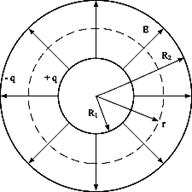 Проиллюстрируем применение принципа суперпозиции для решения этой задачи. Заряды двух концентрических сфер равны +q и –q, радиусы сфер