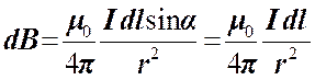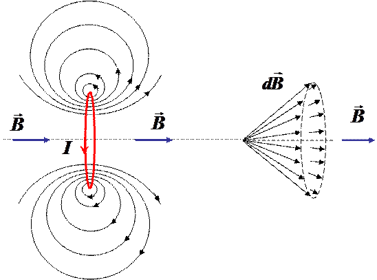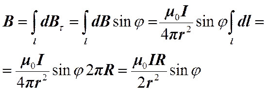 Пусть электрический ток силой течет по проводнику радиусом . Найдем магнитное поле на оси тока в точке А, находящейся на расстоянии от центра. Разобьем круговой ток на элементы тока длиной и проведем от произвольного элемента тока радиус-вектор в точку А. Поскольку все элементы тока перпендикулярны и удалены от А на одинаковое расстояние, то модуль вектора магнитной индукции, создаваемой в этой точке произвольным элементом тока, определяется следующим выражением: