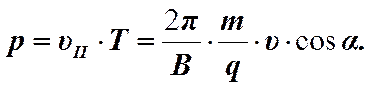 Составляющая силы Лоренца в направлении вектора магнитной индукции (или в направлении v||) равна нулю. Поэтому повлиять на величину скорости v|| сила Лоренца не может. Движение заряженной частицы в магнитном поле можно представить как наложение двух движений: 1) перемещение вдоль вектора B со скоростью v|| = v×cosa; и 2) равномерное вращение в плоскости перпендикулярной вектору B. Радиус окружности, по которой происходит вращение, определяется формулой (1). Траектория движения – спираль, ось которой совпадает по направлению с направлением вектора B. Шаг спирали будет определяться выражением.
