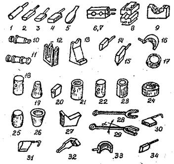 с помощью, которого производится формоизменение заготовки: раскатки 1-5 круглая, полукруглая, овальная, прямоугольная, фасонная; обжимки 6-7 с соответствующей формой внутренних полостей полуматриц; сменные вырезные бойки 8; вкладыши 9 врезных бойков; оправки 10-11 коническая и цилиндрическая; скоба 12; козлы 13; пережимки 14-17 круглого или сложного профиля режущей частью - фасонные, кольцевые; прошивни 18-21; надставки 22-23; кольцо; оправки калибровочные, бочкообразные 25; конические 26; подкладной штамп 27; вилки 28,29; топоры 30-33; квадрат 34 в другие.