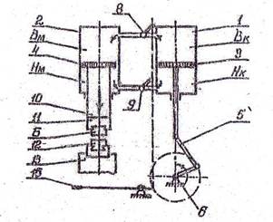 Рис. 3 В общем, литом корпусе молота, выполнены компрессорный I и рабочий молотовый 2 цилиндры. Поршень 3 компрессора, приводимый в движение посредством кривошипно-шатунного механизма 5 и клиноременной передачи от электродвигателя 6, производит засасывание и сжатие рабочего газа-воздуха попеременно в верхней Вк и нижней Нк полостях-цилиндрах. Компрессорные полости соединены каналами соответственно с верхней Вм и нижней Нм полостями молотового цилиндра 2 через управляемые краны-золотиики 8 и 9. Поступающий из компрессора сжатый (высокого давления) воздух попеременно оказывает давление на поршень 4 молота. Поршень 4 изготовлен монолитно со штоком 10 и бабой II, в нижней части которой посредством хвостовика формы ласточкиного хвоста и запорного клина закреплен верхний боек Б. Нижний боек 12 аналогично укреплен и подушке 13, установленной в гнезда массивного металлического основания – шаботе 14, опирающегося на независимый от станины молота фундамент. Вес шабота в 15-20 раз больше веса падающих частей молота. Управление молотом осуществляется посредством ножной педели 15 (или рукоятки), приводящей краны 8 и 9. Крановое воздухораспределение обеспечивает работу молота единичными или несколькими ударами, автоматически следующими друг за другом, а также позволяет удерживать бабу в верхнем положении неподвижно при работающем компрессоре. Число ударов бойка можно менять от 25 до 225 в минуту (в автоматическом режиме). Date: 2015-05-04; view: 673; Нарушение авторских прав |