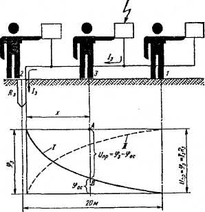 ах х(х-та) Напряжение прикосновения максимально около заземлителя и уменьшается с отдалением от заземлителя. Вне границ поля растекания оно равно нолю. Шаговое напряжение также растет с увеличением длины шага. Ток, обусловленный шаговым напряжением