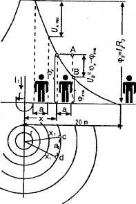 Рис. 3.14. Шаговое напряжение При расположении одной ноги человека на расстоянии х от заземлителя и ширине шага а (в практических расчетах а = 0,8 м)