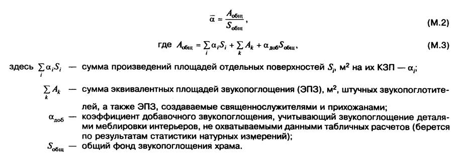 В случае если расчет времени реверберации по формулам (M.1)-(М.3) покажет значения, выходящие из рекомендуемых по рисунку M.1, то следует провести корректировку объемно-планировочного решения и материалов отделки интерьеров проектируемого храма. При избыточных значениях времени реверберации (при недостаточности общего фонда звукопоглощения) следует, во-первых, уменьшить воздушный объем помещения при неизменности площади пола основного и боковых нефов и, во-вторых, увеличить звукопоглощающие свойства материалов отделки интерьеров. Если проведенный контрольный расчет времени реверберации по-прежнему покажет избыточные значения времени реверберации, то следует принять дополнительные меры к увеличению фонда звукопоглощения храма. При значительном превалировании времени реверберации в диапазоне низких частот можно использовать "голосники", выполненные по современной строительной технологии, методы расчета которых приведены в издании (9). В диапазоне средних и высоких частот для увеличения звукопоглощения рекомендуется использовать тканевые элементы убранства храма. Их общее количество определяется акустическим расчетом. При недостаточности времени реверберации храма следует принять меры к увеличению его общего воздушного объема и к уменьшению фонда звукопоглощения в убранстве храма. При выборе объемно-планировочных решений храмов кривизну куполов и сводов следует выбирать так, чтобы их центры размещались значительно выше отметки пола (не ниже уровня +3,0 м по отношению к уровню пола алтаря и солеи). В храмах с делением на средний и боковые нефы или трапезную часть, особенно при высоком центральном куполе, статистический метод расчета времени реверберации неприменим. Расчет процесса реверберации следует начинать с определения среднего КЗП каждого i-го объема в диапазоне частот 125-4000 Гц (альфа_i), на основании которого рассчитывается его фонд звукопоглощения: