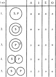 В ней указаны возможные значения истинности суждений различных видов при различных отношениях между объемами их терминов (S и P). Например, нет строк, в которых суждения форм А и О оба имеют значение “истина”, нет таких строк, в которых оба имеют значение “ложь”. Следовательно, суждения А и О находятся в отношении контрадикторности.