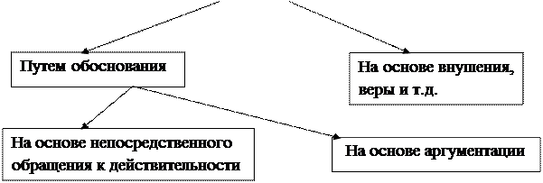 Аргументация — один из способов обоснования утверждений (суждений, гипотез, концепций и т.д.). Утверждения могут обосновываться путем непосредственного обращения к действительности (посредством наблюдения, эксперимента и других видов практической деятельности), а также с помощью уже известных положений (аргументов) и средств логики. Во втором случае обоснование тоже осуществляется путем обращения к действительности, но не непосредственного, а опосредованного. В курсе логики изучается обоснование второго рода, называемое аргументацией. Аргументация — это полное или частичное обоснование какого-либо утверждения с использованием других утверждений. Предполагается, что в хороших (правильных[29]) аргументациях другие утверждения полностью или хотя бы частично обоснованы и обосновываемое положение из них логически следует или, по крайней мере, они подтверждают его. Задачей аргументации является выработка убеждения или мнения в истинности какого-либо утверждения. Убеждение — полная уверенность в истинности, мнение — тоже уверенность, но неполная. Убеждение и мнение могут, конечно, вырабатываться не только на основе аргументации или наблюдения и практической деятельности, но и путем внушения, на основе веры и т.д.