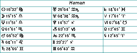 Этот материал нельзя назвать уроком. Он предназначен тем, кто не имеет возможности построить и увидеть свой гороскоп или гороскоп близким. Здесь я дам рекомендации о том, как нарисовать гороскоп по данным (координаты планет) присланным астрологом. Это необходимо, прежде всего, для того, чтобы осваивать уроки практически. Для консультирования Вам понадобиться астрологическая программа. Вам предоставляется возможность получить бесплатно данные только для одного гороскопа. Присланные заказы на расчет данных для другого гороскопа необходимо оплатить в размере $3 США в рублях, по курсу валют на день оплаты. Для предъявления заказа Вам потребуется написать письмо о заказе. В нем необходимо указать данные Вашего рождения (число, месяц, год, место и время). Также для уточнения времени рождения пришлите данные нескольких важных событий Вашей жизни (месяц, год и число по возможности). Например: § знакомство с будущим мужем, § брак и развод, § рождение детей, § переезд на другое место жительства, § смерть близких родственников или психологические кризисы. На Ваш адрес буде выслан ответ. Если это первый заказ от Вас, то на первые данные рождения будет направлено письмо с данными гороскопа, а на другие Высланы реквизиты счета для оплаты работы. Вам, чтобы получить данные гороскопов потребуется прислать сообщение об оплате: сообщение об оплате заказа Приступлю к изложению обещанного материала. 1й шаг. На заказ в ответ Вы получите такую таблицу с данными положения объектов гороскопа: