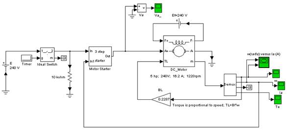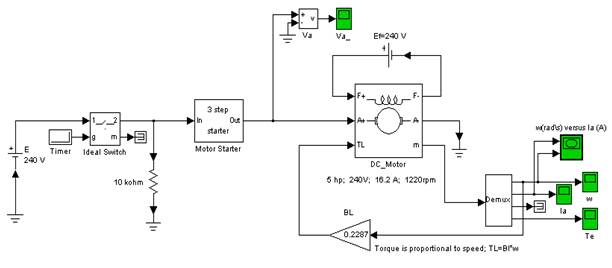 Ход работы Смоделируем в пакете Simulink/MATLAB схему включения двигателя постоянного тока (рис.1). В нее входят следующие элементы: o Двигатель постоянного тока с независимым возбуждением; o Два источника постоянного напряжения 240 В (для якоря и обмотки возбуждения); o Выключатель, подающий питание на якорь двигателя через 0,5с после включения обмотки возбуждения. Это необходимо для того, чтобы избежать нежелательного воздействия переходных процессов, происходящих в обмотке возбуждения; o Измерительная система, позволяющая получать временные характеристики напряжения на обмотке якоря двигателя, частоты вращения, крутящего момента и тока обмотки якоря двигателя, а также его механическую характеристику; o Устройство пуска, представляющее собой три последовательно включенных токоограничивающих резистора, последовательное шунтирование которых позволяет выйти на естественную механическую характеристику в 3 шага, избегая высоких пусковых токов. Замыкание шунтирующих цепей происходит при помощи реле времени (рис.2).