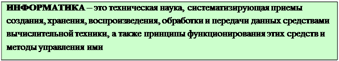 Термин "информатика" (франц. informatique) происходит от французских слов information (информация) и automatique (автоматика) и дословно означает "информационная автоматика". Широко распространён также англоязычный вариант этого термина — "Сomputer science", что означает буквально "компьютерная наука". Инфоpматика — это основанная на использовании компьютерной техники дисциплина, изучающая структуру и общие свойства информации, а также закономерности и методы её создания, хранения, поиска, преобразования, передачи и применения в различных сферах человеческой деятельности.