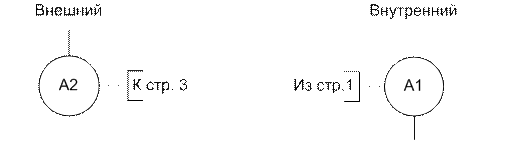 4.2.4. Линии в схемах должны подходить к символу либо слева, либо сверху, а исходить либо справа, либо снизу. Линии должны быть направлены к центру символа. 4.2.5. При необходимости линии в схемах следует разрывать для избежания излишних пересечений или слишком длинных линий, а также, если схема состоит из нескольких страниц. Соединитель в начале разрыва называется внешнем соединителем, а в конце разрыва - внутренним соединителем. 4.2.6. Ссылки к страницам могут быть приведены совместно с символом комментария для их соединителей.