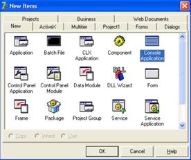 Создается консольное приложение с помощью команды File | New | Other Application. На вкладке New появившегося диалогового окна New Items необходимо выбрать тип создаваемого приложения — Console Application. В результате этих действий на экране появится окно Projectl.dpr, в котором находится шаблон главной процедуры консольного приложения. В этом окне можно набирать инструкции программы.