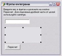 1.1. Написать программу, которая пересчитывает скорость ветра из "метров в секунду" в "километров в час". Рекомендуемый вид формы приведен на рис. 1.1. Программа должна быть спроектирована таким образом, чтобы пользователь мог ввести в поле «Скорость» только целое положительное число. Вычисление должно выполняться как в результате щелчка на кнопке «Пересчет», так и при нажатии клавиши <Enter> после ввода последней цифры в поле «Скорость». При незаполненном поле «Скорость» кнопка «Пересчет» должна быть недоступна. 1.2. Написать программу, которая пересчитывает массу из фунтов в килограммы (1 фунт = 409,5 грамм). Рекомендуемый вид формы приведен на рис. 1.2. Программа должна быть спроектирована таким образом, чтобы кнопка «Пересчет» была доступна только в том случае, если пользователь ввел исходные данные.