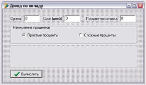 Рис. 1.3. Форма программы Скорость бега Рис. 1.4. Форма программы «Стоимость покупки» 1.5. Напишите программу, которая вычисляет доход по вкладу. Программа должна обеспечивать расчет простых и сложных процентов. Простые проценты начисляются в конце срока вклада, сложные — ежемесячно и прибавляются к первоначальной сумме вклада и в следующем месяце проценты начисляются на новую сумму. Рекомендуемый вид формы программы приведен на рис. 1.5. 1.6. Написать программу, которая вычисляет сопротивление электрической цепи, состоящей из двух сопротивлений. Сопротивления могут быть соединены последовательно или параллельно. Рекомендуемый вид формы приведен на рис. 1.6. Если величина сопротивления цепи превышает 1 000 Ом, то результат должен быть выведен в килоомах. Программа должна быть спроектирована таким образом, чтобы кнопка «Вычислить» была доступна только в том случае, если пользователь ввел исходные данные