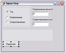 Рис. 1.5. Форма программы Доход по вкладу Рис. 1.6. Форма программы Сопротивление электрической цепи 1.7. Написать программу, которая, используя закон Ома, вычисляет силу тока, напряжение или сопротивление электрической цепи. Рекомендуемый вид формы приведен на рис. 1.7. Во время работы программы, в результате выбора переключателя Ток, Напряжение или Сопротивление, текст, поясняющий назначение полей ввода, должен меняться. 1.8. Написать программу, которая вычисляет стоимость поездки на автомобиле, например, на дачу. Рекомендуемый вид формы приведен на рис. 1.8.