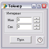 Рис. 1.11. В окне программы Электронные часы отображается текущее время, дата и день недели 1.12. Напишите программу "Таймер". На рис. 1.12 приведена форма и окна программы во время установки интервала и в процессе отсчета времени. В разных режимах компоненты становятся видимыми (Visible). 1.13. Напишите программу "Таймер". Для ввода интервала используйте компоненты upDown. Рекомендуемый вид формы при веден на рис. 1.13. (Чтобы обеспечить синхронизацию компонентов UpDown и Edit, нужно в свойство Associate компонента UpDown записать имя соответствующего компонента Edit. Это надо сделать во время создания формы.)
