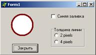 Рис.1.17. Рис.1.16. 1.18. На форме находится фигура (tShape). Используя четыре, кнопки заставьте фигуру передвигаться по форме. Прямоугольник не должен выходить за границы окна. 1.19. На форме находится фигура (tShape). Используя radio group, изменяйте толщину линий фигуры. CheckBox должен изменять цвет заливки с белого на синий и наоборот.