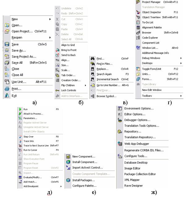 Рис. 4. Меню Delphi: а – File; б – Edit; в – Search; г – View; д – Run; е - Component; ж - Tools; Меню File Команды выпадающего меню File (рис. 4, а) можно использовать для работы, как с проектами, так и с файлами исходного кода. К командам, работающим с проектами, относятся New, New Application, Open, Reopen, Save Project As, Save All, Close All, Add to Project и Remove from Project. С файлами исходного кода работают команды New, New Form, New Data Module, Open, Reopen, Save As, Save, Close и Print. Основной командой является File/New, которую можно использовать для вызова экспертов, для начала работы с новым приложением, для наследования формы из уже существующей и т.д. Чтобы открыть проект или файл исходного кода, с которыми вы работали последний раз, используйте команду File/Reopen. Меню Edit Стандартные возможности меню Edit (рис. 4, б) применимы как к тексту, так и к компонентам формы. Можно копировать и вставлять тот или иной текст в редакторе, копировать и вставлять компоненты в одной форме или из одной формы в другую. Также можно копировать и вставлять компоненты в другое групповое окно той же формы, например, в панель или блок группы; копировать компоненты из формы в редактор, и наоборот. Delphi помещает компоненты в буфер обмена, преобразуя их в текстовое описание. Можно соответствующим образом отредактировать этот текст, а затем вставить его обратно в форму в виде нового компонента. Можно выбрать несколько компонентов и скопировать их как в другую форму, так и в текстовый редактор. Это может пригодиться, когда вам придется работать с рядом схожих компонентов. Вы сможете скопировать один компонент в редактор, размножить его нужное число раз, а затем вставить назад в форму целую группу. Меню Search Если вы выберете команду Incremental Search (рис. 4, в), то вместо того чтобы показать диалоговое окно, где вводится образец для поиска, Delphi переходит в редактор. Когда вы введете первую букву, редактор перейдет к первому слову, которое начинается с этой буквы. Продолжайте набор букв и, курсор будет последовательно переходить к словам, в начале которых будут стоять введенные символы. Эта команда очень эффективна и чрезвычайно быстра. Команда Browse Symbol вызывает Object Browser – инструмент, который можно использовать для просмотра многих деталей при исследовании откомпилированной программы. Меню View Большинство команд меню View (рис. 4, г) применяются для отображения какого-либо окна среды Delphi, например Project Manager, Breakpoints List или Components List. Эти окна не связаны друг с другом. Эти окна не связаны друг с другом. Команда Toggle Form/Unit используется для перехода от формы, над которой вы работаете к ее исходному коду, и обратно. Команда New edit window создает дубликат окна редактирования и его содержимого. В Delphi это единственный способ просмотреть два файла рядом друг с другом, поскольку редактор для показа нескольких загруженных файлов использует ярлычки. После дублирования окна редактирования могут содержать разные файлы. Последние две команды меню View можно использовать для удаления с экрана полоски SpeedBar и палитры Components, хотя при этом среда Delphi становится менее удобнее для пользователя. Команда Build All заставляет Delphi откомпилировать каждый исходный файл проекта, даже если после последней трансляции он не был изменен. Для проверки написанного кода без создания программы можно использовать команду Syntax Check. Команда Information дает некоторые подробности о последней выполненной вами трансляции. Команда Options применяе