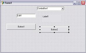 Рис. 5. Окно Form1 с набором диалоговых компонентов При работе с формой можно обрабатывать ее свойства, свойства одного из ее компонентов или нескольких компонентов одновременно. Чтобы выбрать форму или компонент, можно просто щелкнуть по нему мышью или воспользоваться Object Selector (комбинированный список в Object Inspector), где всегда отображены имя и тип выбранного элемента. Для выбора нескольких компонентов можно или нажать клавишу Shift и щелкать по компонентам левой кнопкой мыши, или отбуксировать в форме рамку выбора. SpeedMenu формы содержит ряд полезных команд. Для изменения относительного расположения компонентов одного вида можно использовать команды Bring to Front и Send To Back. Командой Revert To Inherited можно воспользоваться, чтобы в унаследованной форме установить те значения свойств выбранного компонента, которые были у них в родительской форме. При выборе сразу нескольких компонентов вы можете выровнять их или изменить их размеры. С помощью SpeedMenu можно также открыть два диалоговых окна, в которых устанавливается порядок обхода визуальных управляющих элементов и порядок создания невизуальных управляющих элементов. Команда Add To Repository добавляет текущую форму в список форм, доступных для использования в других проектах. Для установки положения компонента кроме применения мыши имеются еще два способа: - установка значений для свойств Top и Left; - использование клавиш курсора при нажатой клавише Ctrl. Метод Ctrl+клавиша курсора особенно удобен при тонкой подстройке положения элемента. Точно также, нажимая клавиши курсора при нажатой клавише Shift, можно подстроить размер компонента.