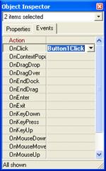 Рис. 13.Окно Object Inspector (на вкладке Events перечислены события, которые может воспринимать компонент (в данном случае — командная кнопка) Для того чтобы создать функцию обработки события, нужно сделать двойной щелчок мышью в поле имени процедуры обработки соответствующего события. В результате этого откроется окно редактора кода, в которое будет добавлен шаблон процедуры обработки события, а в окне Object Inspectorрядом с именем события появится имя функции его обработки (рис. 14).