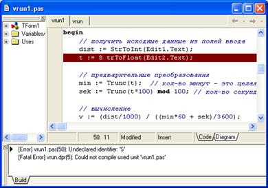 Рис. 20.Сообщения компилятора об обнаруженных ошибках Если во время компиляции окна Compiling на экране нет, то выберите из меню Tools команду Environment options и на вкладке Preferences установите во включенное состояние переключатель Show compiler progress. Компиляция проекта происходит при запуске его на выполнение. Транслируя проект Delphi компилирует только те файлы, которые изменялись. Но если вы выберите в меню Project команду Build All, то будет откомпилирован каждый файл, даже если он не изменялся. Проект содержит список файлов исходного кода, которые являются частями проекта, а также соответствующих им форм (при наличии таковых). Сначала каждый файл исходного кода превращается в откомпилированный модуль Delphi – файл с тем же именем, что и у исходного файла на языке Паскаль, но с расширением DCU. Во время компиляции и компоновки самого проекта откомпилированные модули, составляющие проект, сливаются (или связываются) друг с другом и с кодом библиотеки VCL, образуя исполнимый файл.