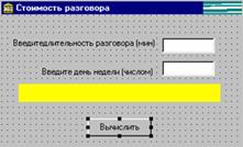 На рис. приведен вид диалогового окна программы. Для ввода исходных значений (длительность разговора, номер дня недели) используются поля редактирования, для вывода результата и пояснительного текста — поля меток. Ниже перечислены компоненты и приведены значения их свойств. Edit1 – ввода длительности разговора в минутах Edit2 – ввода номера дня недели Label1, Label2 – вывода пояснительного текста о назначении полей ввода. Label3 – вывода результата вычисления стоимости разговора Button 1 – Активизации процедуры вычисления Здесь и далее при описании формы приложения приводятся значения только тех свойств компонентов, которые используются в программе. Значения остальных свойств могут быть оставлены без изменения или изменены произвольным образом, естественно, в разумных пределах (очевидно, что размер командной кнопки может быть выбран произвольно). Программа производит вычисления при щелчке на командной кнопке Вычислить. В этом случае возникает событие Ondick, процедура обработки которого приведена ниже.