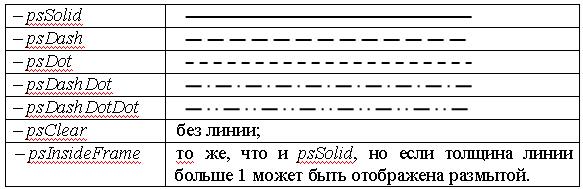 Свойство Pen отвечает за обрамления фигуры и имеет четыре свойства: ∙ Color – цвет обрамления; ∙ Mode – режим отображения (способ взаимодействия цвета линии с цветом холста), может принимать следующие значения: - pmBlack – всегда черный; - pmWhite – всегда белый; - pmNop – цвет линии не взаимодействует с цветом холста; - pmNot – цвет, инверсный цвету фона холста; - pmCopy – цвет линии определяется в свойстве Color; - pmNotCopy – цвет, инверсный цвету, определённому в свойстве Color; - pmMergePenNot – цвет образуется путём объединения цвета линии и инверсного цвета фона холста; - pmMaskPenNot – цвет образуется путём объединения цветов, общих для цвета линии и инверсного цвета фона холста; - pmMergeNotPen – цвет образуется путём объединения цвета фона холста и инверсного цвета линии; - pmMaskNotPen – цвет образуется путём объединения цветов, общих для цвета фона холста и инверсного цвета линии; - pmMerge – цвет образуется путём объединения цвета линии и цвета фона холста; - pmNotMerge – цвет, инверсный значению pmMerge; - pmMask – цвет образуется путём объединения цветов, общих для цвета фона холста и цвета линии; - pmNotMask – цвет, инверсный значению pmMask; - pmXor – цвет образуется путём объединения несовпадающих цветов линии и фона холста; - pmNotXor – цвет, инверсный значению pmXor; ∙ Style – стиль линии, может принимать следующие значения: