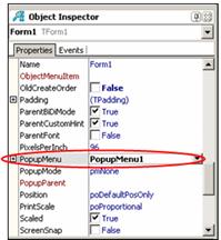 Рис. 1. Меню формы В Delphi главное меню представлено компонентом класса TMainMenu. На форму можно поместить сколько угодно объектов этого класса, но отображаться будет только одно (указанное в свойстве Menu формы). Контекстное (всплывающее) меню появляется при размещении указателя в форме или в области некоторого элемента управления и нажатии правой кнопки мыши. Контекстное меню содержит команды, влияющие только на тот объект, для которого вызвано это меню. Контекстное меню в Delphi представлено компонентом класса TPopupMenu. Его основные свойства: ú AutoPopup – логическое свойство, определяющее, появляется ли контекстное меню при щелчке правой кнопки мыши и размещении указателя на компоненте, использующем это меню; ú Alignment – определяет место появления контекстного меню по отношению к указателю мыши. Свойство Alignment может принимать значения: ° paLeft (по умолчанию) – положение указателя определяет положение левого верхнего угла меню; ° paCenter – положение указателя определяет положение центра меню по горизонтали; ° paRight – положение указателя определяет положение правого верхнего угла меню. Для того чтобы контекстное меню появлялось при щелчке на компоненте, необходимо его свойству PopupMenu присвоить в качестве значения имя требуемого контекстного меню (рис. 2).