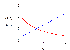 Найдем равновесную цену графически Щелкните по кнопке с изображением графика в панели математических инструментов и в открывшейся панели щелкните по левой верхней кнопке. Появится поле для построения графика. В нижнюю помеченную позицию введите с клавиатуры имя аргумента p, затем щелкните по помеченной позиции с левой стороны, введите с клавиатуры D(p) и щелкните вне прямоугольной рамки. Чтобы построить одновременно несколько графиков функций, нужно ввести имена функций в позиции возле оси ординат, разделяя запятой.