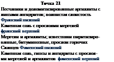 Слой 5 С1t1 Каменная соль; прослои гипсов и ангидритов, серых мергелей, красных аргиллитов с обрывками наземных растений Турнейский ниж.(древнее) Слой 6 С1t2 Брахиоподы Турнейский верхний Слой 7 Песчаники с прослоями известняков и аргил- С1V1 литов; слоистость волнистая; обильные кораллы, продуктиды, мшанки Визейский нижний Слой 8 Аргиллиты, прослои, известняков с кораллами C1V2 и двустворками, песчаники тонкозернистые Визейский верхний Слой 9 Чередующиеся песчаники, аргиллиты с прос- C1S1 лоями каменного угля и известняки с морской Фауной Серпуховский нижний Слой 10 Аргиллиты с прослоями песчаников и извест- C1S2 няков; цвет пород серый; масса кораллов, мшанок и криноидей Серпуховский верхний