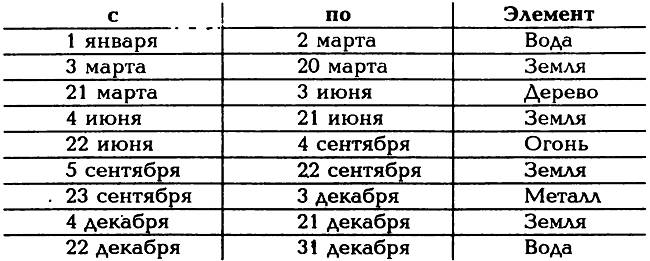 Пять стихий Конечно, название этих стихий не имеет ничего общего с материальным носителем. Это — самостоятельная часть восточной философии, она основана на аналогии, связи мира человека с миром растений, животных и минералов. Каждый элемент непосредственно связан с временем года, с цветом и характером. По теории Хао Вей Панга каждый период связывается с тремя месяцами, начиная с весеннего равноденствия. Древние китайцы считали, что целым годом, но существуют периоды, когда он имеет наибольшее влияние. Существует не четыре времени года, а пять. Каждый элемент владеет не только Согласно году рождения человека, всякий из двенадцати знаков в свое время управляется каждым из элементов. Влияние стихии на знак может быть позитивным, негативным и нейтральным. Чаще восточные мудрецы разделяли влияния на благоприятные и контролирующие.