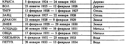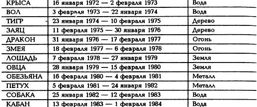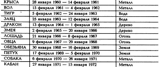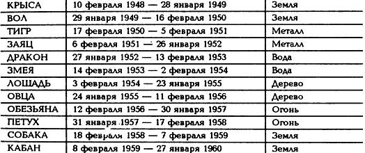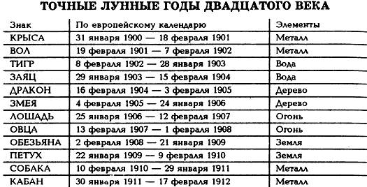 КИТАЙСКОЕ ЛЕТОИСЧИСЛЕНИЕ Принято считать, что китайское летоисчисление начинается в 2397 году до P. X. Если к началу летоисчисления мы прибавим 1994 год, 2397 + 1994 = 4391 — получается, что согласно китайскому календарю мы живем в 4391 году. Разделив полученную цифру на 60 лет большого цикла, мы получим 73 полных цикла и 11 лет в остатке. Согласно таблице это получается год Собаки. Аналогичным способом можно легко высчитать год своего рождения. Мы получим формулу: (2397 + год рождения): 60 = целое число, которое и соответствует названию года. Китайские недели согласованы с лунными фазами, но это слишком неудобно, так как одна неделя в лунном календаре имеет семь суток, а другая — восемь. В конце концов, китайцы сменили неудачную меру на десятидневки. В древности каждый из десяти дней обозначался своим иероглифом, которые назывались небесными ветвями. Позже эти ветви были объединены парами с пятью стихиями и образовали замкнутый круг — десятичный цикл. Месяцы тоже обозначались своими иероглифами, но уже в двенадцатеричном цикле земных корней. Каждому из них соответствовало имя одного из животных. Любопытно, что сочетание небесных ветвей и земных корней еще около 2500 лет тому назад стало служить летоисчислением. Два эти цикла были объединены в "Таблицы цикличных знаков", и они, как мы уже упоминали, охватывали полных 60 лет. В странах Востока не принято называть точный год своего рождения, принято указывать название года и стихию. Если человек скажет, что он родился, например, в год Металлического Тигра, мы должны на него посмотреть и оценить, сколько ему лет. Родился в 1951 году или 1891 году? То есть, на сегодняшний день ему может быть или 43 года, или 103 года. Поэтому в восточном календаре очень легко разобраться, если помнишь все годы с присущими им стихиями. Конечно, сейчас уже не употребляются цикличные знаки для обозначения дней и месяцев, но до недавнего времени обозначения земных корней отмечали различные стороны света на компасе. Китайцы имели этот прибор еще до начала Новой эры. Рисунок такого компаса вы можете увидеть на картинке в центре Деревянного календаря. Север изображался в виде Крысы, Юг — Лошадь, Восток — Заяц, а Запад — Петух. Семьдесят третий цикл китайского циклического календаря начался 2 февраля 1884 года, а закончится 18 февраля 1996 года. И для полной ясности мы помещаем подробную таблицу начала и конца лунных годов по европейскому календарю.