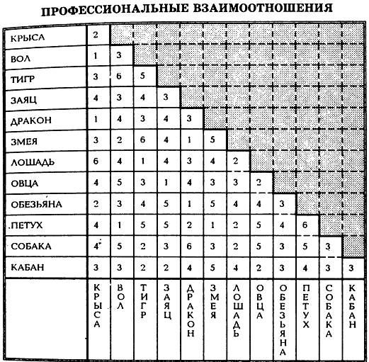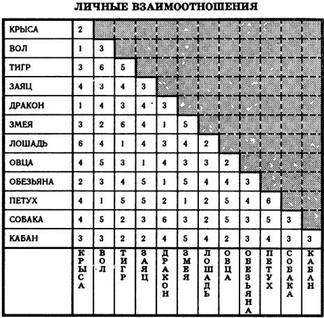 Мы перечислили общие черты Асцендентов, но более подробное влияние на каждый знак мы укажем в общем гороскопе. А сейчас мы хотели бы сказать о влиянии Асцендента на совместимость знаков. Когда дело касается чистых типов, мы легко можем их определить по таблице. Но если, например, Овца рождена с Асцендентом Тигр, она проявит Тигриные черты и будет иметь И потому, когда мы пользуемся таблицей, необходимо иметь в виду дружбу и брак не только чистых типов, но и учитывать другие факторы гороскопа. Многие люди проявляют большую симпатию к рожденным с их Асцендентом, хотя по таблице они совершенно несовместимы. Поэтому еще раз подчеркиваем, что и в этом случае нужно смотреть на суть проблемы значительно глубже. Когда же человек рожден в часы Асцендента, который абсолютно несовместим с его знаком, ему часто бывает трудно. Его натура обретает противоречивые черты, и таких людей разрывают бесплодные страсти. Например, если Петух родится в час Зайца, он может себя проявить, как стеснительный Петух, который втайне вынашивает большие планы. Как правило, такие люди наделены большим честолюбием. Но, вопреки открытому характеру Петуха, такие особы могут стать стеснительными и непроницательными дипломатами. Подобные индивидуумы принадлежат к сложным личностям с непостоянным характером.