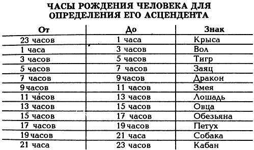 ВАШ АСЦЕНДЕНТ Кроме года рождения, в судьбе человека имеют большое значение и часы рождения. Они подвластны так называемым "восходящим" знакам, или Асцендентам. Асцендент имеет огромное влияние на личность рожденного и если, например, Крыса родится в час Крысы, то она получает чистый тип этого знака. Но если же Дракон родится в час Зайца, то по всей вероятности, Заяц сгладит доминирующие черты Дракона. Одновременно с уже полученными знаниями о знаке Асцендент уточняет дополнительные влияния и помогает человеку выстроить более полную картину его личности. Как мы уже упоминали, в китайском календаре время суток делится на дневное и ночное, но для удобства мы его обозначаем, как европейское. Помещенная ниже таблица поможет определить промежуток времени, принадлежащий Асценденту. Часто Асцендент может оказаться собственным знаком, но это совсем не значит, что он ставит человека в затруднительное положение, просто придется полностью развивать свои Ян и Инь. Поэтому Асцендент часто помогает, словно ангел — хранитель, он дополняет и предохраняет в критические моменты. Это — своеобразный спутник по жизни, а также он помогает быстрее достигнуть желаемой цели.