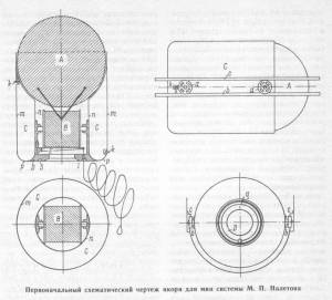 Первоначальный схематический чертеж якоря для мин системы М. П. Налетова На заседании МТК 30 ноября 1907 г. прежде всего был заслушан отзыв капитана 2-го ранга Шрейбера о минах для подводного заградителя, а потом со своими возражениями выступил М. П. Налетов. После обсуждения было принято решение, в котором отмечалось, что предложение николаевского завода разработать детали устройства для постановки мин и систему самих мин можно считать вполне выполнимым при условии, если завод даст гарантии своевременного и удовлетворительного выполнения этого предложения. Далее Комитет счел необходимым дополнить спецификацию и контракт, представленные заводом, рядом пунктов. В частности, МТК указывал, что заградитель должен быть вооружен не менее чем 60 минами, выполненными по чертежам, которые утвердил МТК; мины должны находиться в двух аппаратах в виде желобов и приводиться в движение по рельсам электромотором с соответствующей передачей (цепь или трос). Детали минных труб должны были быть изготовлены после окончательной разработки мин и предварительных их испытаний на специальном понтоне 52, Что касается системы керосиномоторов для заградителя, то МТК решил: "Считать моторы системы Кертинга вполне приемлемыми". Одновременно Комитет дал право заводу и после заключения контракта поставить перед ним вопрос о замене этих моторов. Очевидно, на это разрешение повлияло предложение Михаила Петровича установить на заградителе моторы системы Даймлера (которые начал выпускать петербургский завод Лесснера) как более экономичные и меньшие по весу, чем моторы Кертинга. МТК отметил, что "было бы очень желательно, чтобы эти моторы были построены в России" (моторы Кертинга выпускал завод братьев Кертинг в Ганновере, Германия). Далее МТК постановил произвести испытания корпуса заградителя на стапеле гидравлическим способом, удовлетворив в этом случае требование завода об увеличении срока постройки заградителя на 2 мес 53. В последующий период обсуждали и уточняли статьи проекта контракта, предложенного николаевским заводом. Согласно первоначальной редакции 10-й статьи, Морское министерство при желании продолжить постройку подводных заградителей было обязано (если испытания первого заградителя прошли успешно), заказать первые пять заградителей николаевскому заводу, причем по заранее установленной цене — 2500 руб. за 1 т подводного водоизмещения. Такая редакция 10-й статьи, разумеется, не устраивала Морское министерство. Тогда 10 декабря Общество судостроительных, механических и литейных заводов несколько изменило редакцию этой статьи. Обязательство Морского министерства заказать первые пять заградителей николаевскому заводу оставалось, но завод должен был "...в эти заградители ввести усовершенствования и изменения в зависимости от развития техники подводных лодок и опыта, полученного при постройке и испытании первого заградителя". Цена постройки следующих заградителей уже не фиксировалась заранее, но она должна быть такой, "по какой во время заказа заградителей Морским министерством будут строиться на других частных заводах подводные лодки тоннажа, близкого к минным заградителям" 54. Предложенный заводом проект был переработан МТК, а 16 января 1908 г. одобрен товарищем морского министра. "Контракт с Обществом судостроительных, механических и 