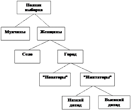Принцип достижимости потребителей означает требование наличия каналов коммуникации фирмы-продавца с потенциальными потребителями. Такими каналами коммуникации могут быть газеты, журналы, радио, телевидение, средства наружной рекламы и т.п. Достижимость потребителей необходима для организации акций продвижения. В основе процедуры сегментации рынка, наравне с применением принципов сегментации, лежит и обоснованный выбор соответствующего метода сегментации. Наиболее распространенными методами сегментирования рынка являются метод группировок по одному или нескольким признакам и методы многомерного статистического анализа. Методгруппировок состоит в последовательной разбивке совокупности объектов на группы по более значимым признакам. Далее на основе определенных факторов группы подразделяются на соответствующие подгруппы (см. рис. 3).
