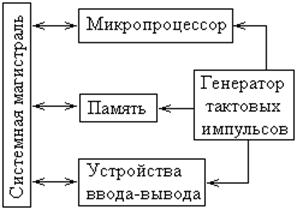 Особый класс БИС представляют микропроцессоры (МП). Они применяются для управления самыми разными техническими объектами – станками, автомобилями, электродвигателями, устройствами бытовой техники и т.д. Функции МП не фиксированы, а задаются внешними электрическими сигналами и могут меняться программным путем. Микропроцессоры – это универсальные программно–управляемые устройства обработки данных. Устройство, содержащее один или несколько микропроцессоров, память для хранения управляющих программ и интерфейсные схемы, обеспечивающие связь с устройствами ввода–вывода, называют микроЭВМ (Рис. 9.1). Перечисленные функциональные узлы микроЭВМ между собой соединяются многопроводными линиями связи – магистралями. По каждой линии передается один разряд двоичных данных. Число линий в магистрали равно наибольшему разряду передаваемых данных. Одна магистраль связывает различные устройства и используется для передачи данных в обоих направлениях. Для исключения наложения сигналов в магистрали право доступа к ней в конкретный момент времени предоставляется только одному источнику данных. Применение магистрального принципа связи внутри МП и микроЭВМ продиктовано необходимостью минимизировать число соединительных линий внутри БИС, а также внешних выводов БИС.