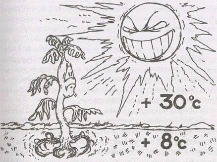 Готовя участок под саженцы или многолетники, он прежде всего насыпает на почву 10-12 см мелкого щебня, а на суглинке ещё и 5-6 см песка. Тщательно перекапывает, перемешивает садовыми вилами — в первый и последний раз. Саженцы высаживаются под лопату, в небольшие ямки по размеру корней. Никаких удобрений: корни должны развиваться — трудиться, искать, а не просто «жрать»! Кроме теплоёмкости и рыхлости, щебень даёт саженцам более мочковатую корневую систему. Это и лишние питающие.корни, и высокая надёжность пересадки. Дальше кладётся закваска, а потом ежегодно наслаивается мульча. Корни винограда изолируют от холода и снизу. Для этого выкапывают траншеи на 70-80 см, до глиняного пласта. На дно укладывают 20-25 см древесных отходов и опилок — это «матрас». Засыпают траншеи с изрядной добавкой песка или щебня. И сверху — мульча. Солнечное тепло ловят разными способами. Скандинавы, например, покрывают междурядья асфальтом. Уральцы укрывают почву рубероидом и ограждают посадки плёночным «забором». Кузнецов успешно использовал щебень, автошины, тёмную растительную мульчу. А сейчас приспособил толстые водяные рукава из чёрной пленки. По бордюрам использует крупные камни: весной они нагреваются первыми и хорошо передают тепло. А иногда, чтобы ускорить и усилить прогрев, формирует грядки с уклоном к югу. Такие «горки» дают растениям опережение в 10-15 дней. Конечно, не обойтись и без тёплого воздуха. Многие растения и саженцы выращиваются под плёнкой. Для этого разработана простая модульная конструкция — она позволяет без проблем накрывать большие площади (фото 7). Здесь, под плёнкой, те же водяные рукава особенно эффективно стабилизируют тепловой режим. Однако, как и в грунте, температура воздуха — ещё не само тепло! У воздуха есть теплоёмкость, и она тем больше, чем выше его влажность. Скачки теплоёмкости ощущаются намного жёстче, чем скачки температуры. Вспомните баню: поддал — температура падает, а уши сворачиваются! С точки зрения растений, примерно то же мы устраиваем в огороде: полил — «баня», высохло — ночью больше холода. В природе и от этой беды спасает мульча: стабилизирует не только температуру, но и влажность, и теплоёмкость воздуха. Третий фактор природного земледелия осознать труднее всего: энергетика хозяина. В природе растения — не просто еда. Это полноценные сознательные существа, партнёры и кормильцы. Александр Иванович воспринимает их именно так. И они отзываются на это! В питомнике даже плоскорезам нет места. Почву и мульчу стараются вообще не ворошить: это смерть для грибов. Да и не повернёшься с инструментом: каждая пядь земли засажена! Сорняков совсем немного, и они легко вытаскиваются руками. Растения Кузнецов обрабатывает, формирует тоже руками. Он уверен: прикосновение — самый плотный обмен энергетикой, а вкупе с настроением — настоящее садовое «хиллер- ство». Может, ещё и поэтому при такой плотности посадок его растения совершенно не страдают?.. Очень важный фактор — генетика растения, сортовые качества. Селекционеры выдали в производство целый ряд прекрасных сверхинтенсивных сортов: спуры и кольчаточники у плодовых (о них — ниже), ремонтантные и крупноплодные у ягодных. Проблема в том, что их потенциал очень трудно раскрыть. Многие садоводы, и даже агрономы на этом попадаются. Берут сорт — и вскоре ругают: ну вот, ещ
