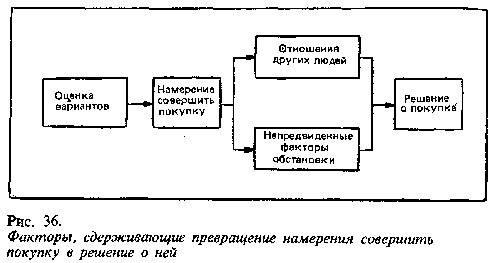 Оценка вариантов ведет к ранжированию объектов в комплекте выбора. У потребителя формируется намерение совершить покупку, причем наиболее предпочтительного объекта. Однако на пути от намерения до принятия решения в дело могут вмешаться еще два фактора (см. схему на рис. 36). Первый фактор - отношения других людей. Предположим, муж Бетти Смит настаивает, чтобы в целях экономии она купила самую дешевую камеру. В результате вероятность покупки более дорогой из выбранных Бетти камер несколько снизится. Степень изменения зависит от двух факторов: 1) интенсивности негативного отношения другого лица к предпочтительному варианту потребителя и 2) готовности потребителя принять пожелания другого лица. Чем острее негативный или позитивный настрой другого лица и чем ближе это лицо к потребителю, тем решительнее пересмотрит он свое намерение совершить покупку в ту или другую сторону.
